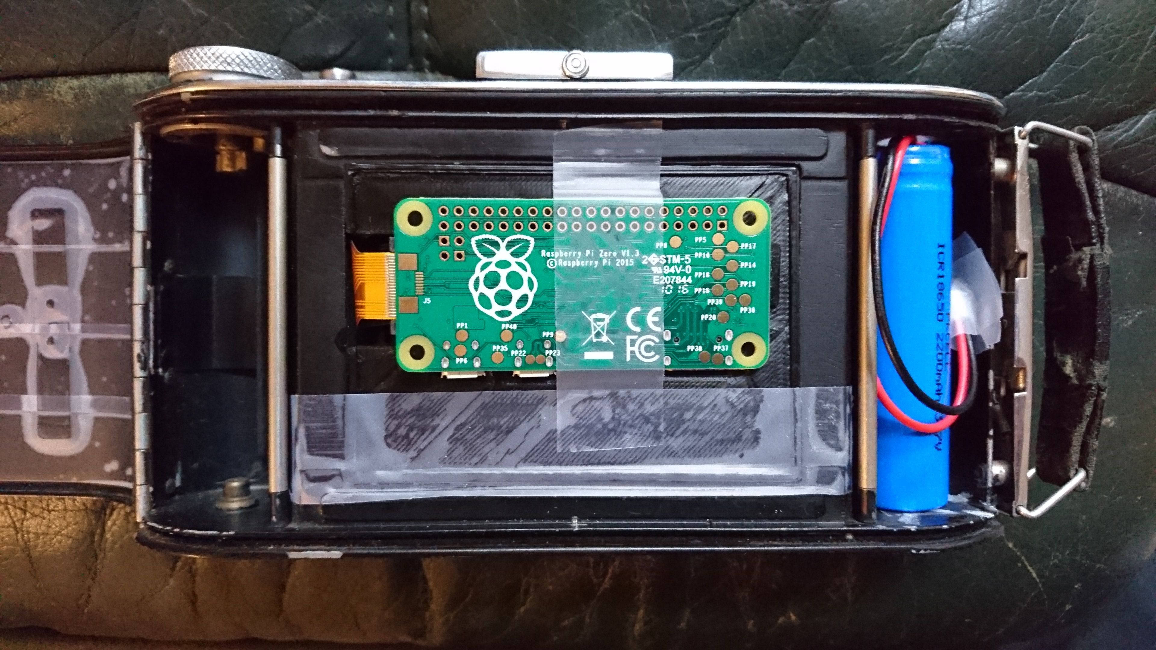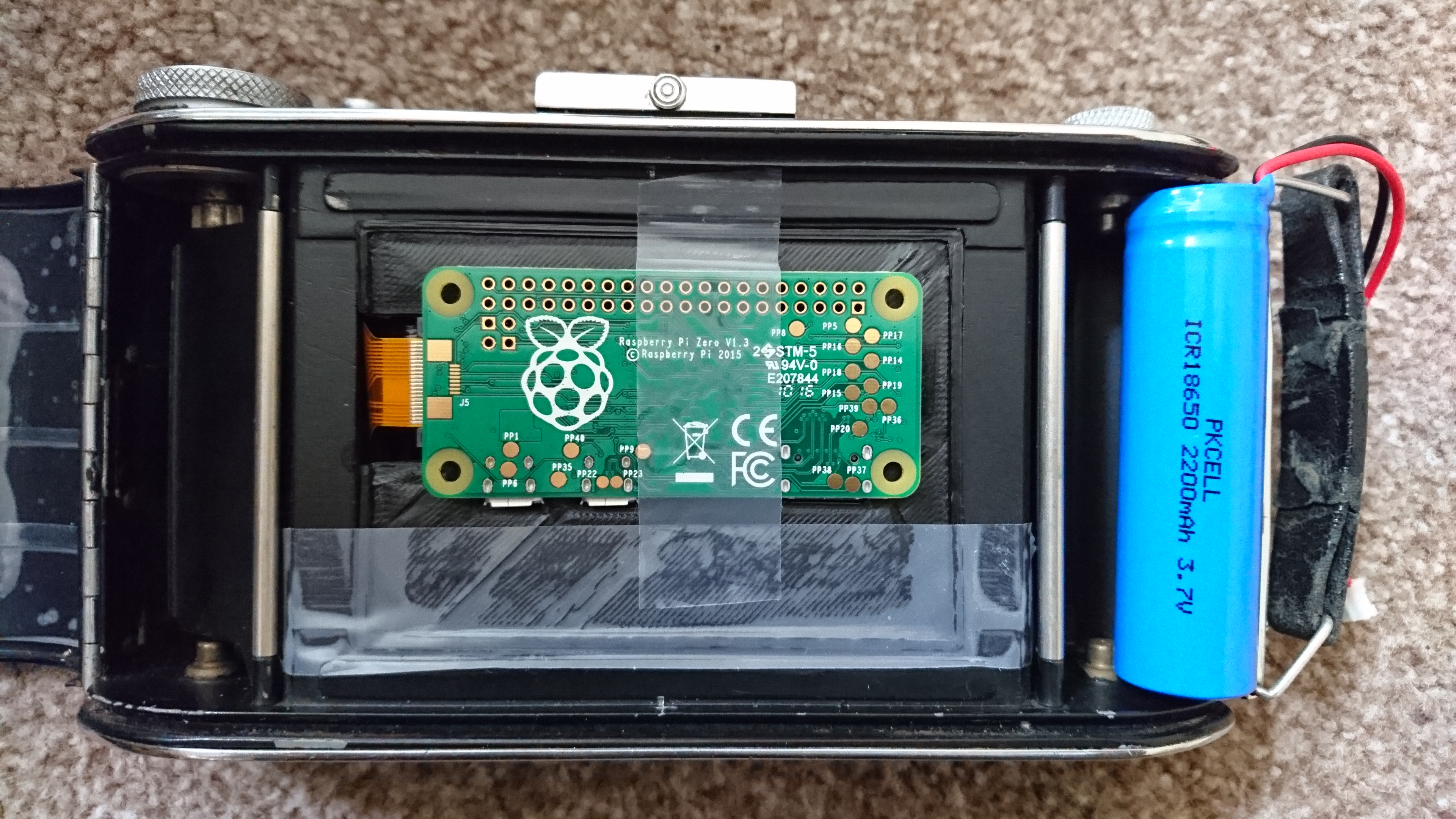 After a little research, the 18650 2200mAH LiIon sold by Piromoni fits almost perfectly where the roll of film would normally sit in the retro camera. I did have to "adjust" the camera frame slightly by removing the small axle stub at the bottom and the sprung loaded mechanism at the top. I won't lie, the battery was actually more luck than judgement as I thought it looked like it might fit and bought it anyway.