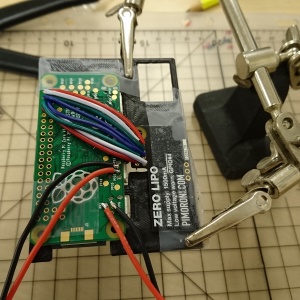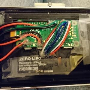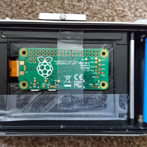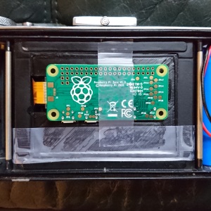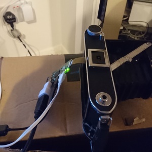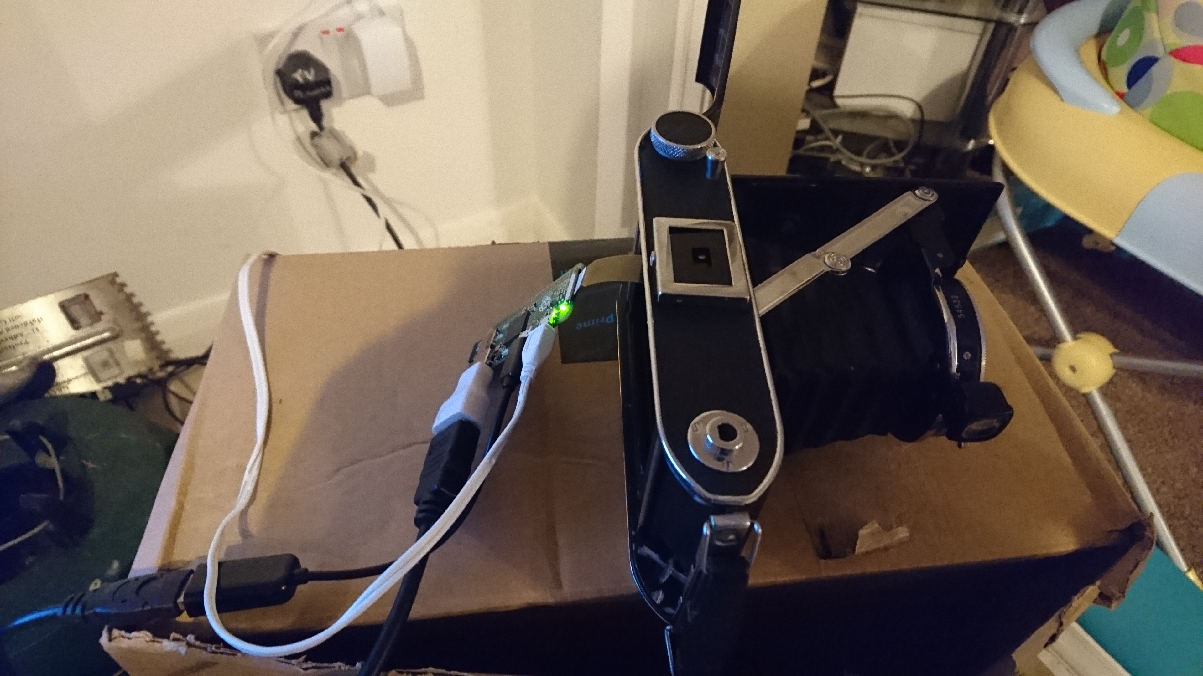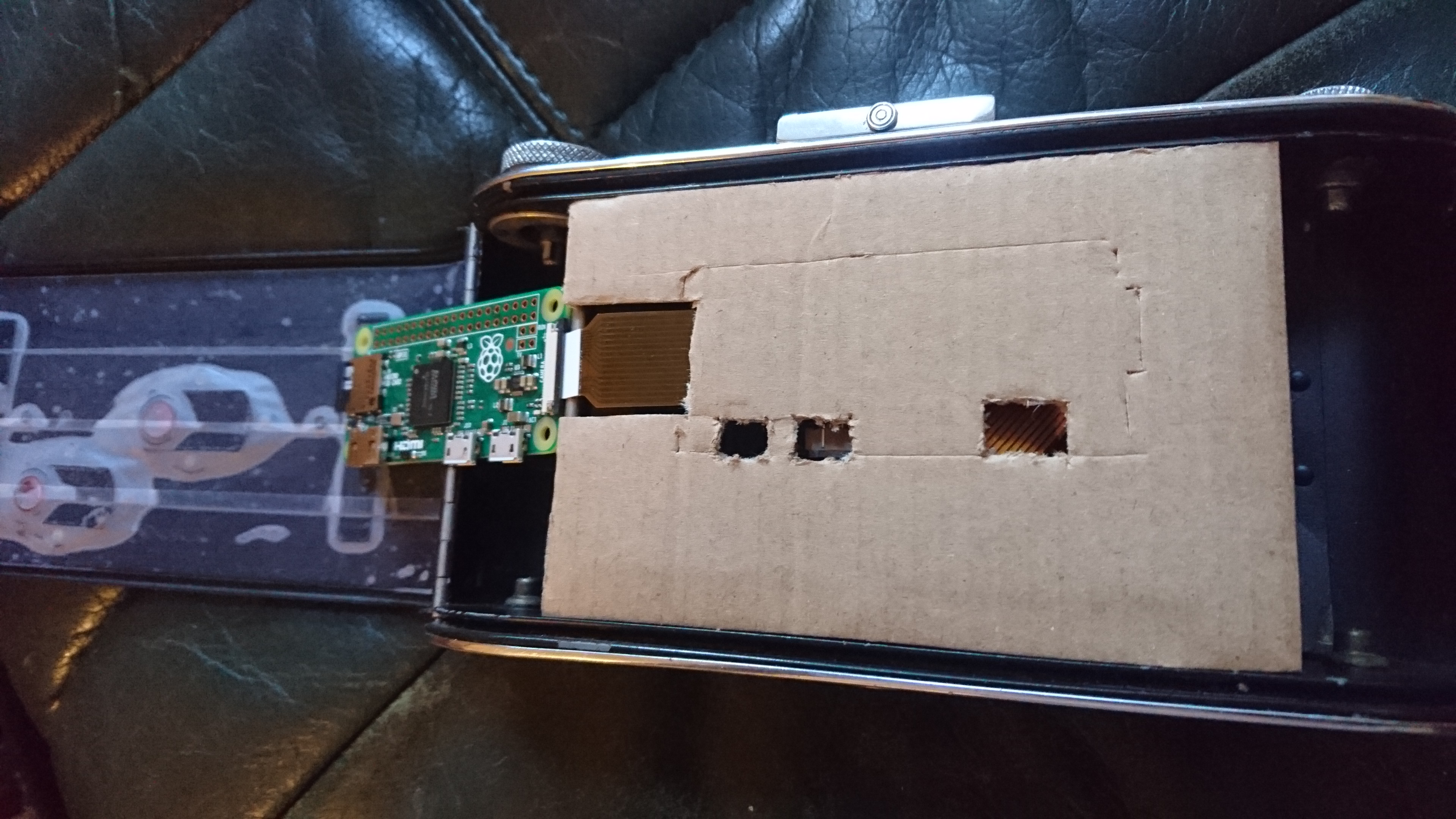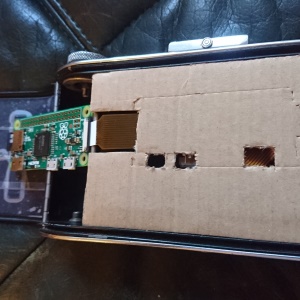 Now I had to decide how to hold the Pi Zero inside the camera. Simplest option was to mount it to a plate that would sit where the film normally would. I knocked up a prototype plate with cardboard and a craft knife. This meant I could easily test positioning the Pi Zero. Once finalised, this could be replicated in CAD and 3D printed for best strength vs material thickness. Once printed, I could wire up the battery controller to the Pi Zero and directly solder a female USB connector to the test pins on the back as there would be no room to use the micro USB connectors. The USB would be used as either a direct USB mass media storage option or my favourite option would be to plug in a wifi dongle and have the retro camera wifi enabled. In the future it could automatically upload photos to instagram or a dropbox / google drive.