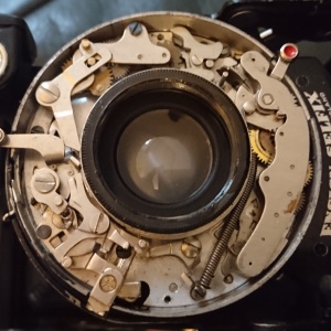 One of the trickiest problems was how to connect the Pi Zero to the original shutter release mechanism. Due to the beautiful folding bellows, the mechanical button on top actually pushes a series of pivoting levers which then push the shutter release lever mounted on the lens ring. To avoid interfering with the folding bellows and to keep the original aesthetics I couldn't put wires on the outside. I was (and still to be honest) thinking of running wires on the inside of the bellows to the actual clockwork shutter release mechanism. I even bought a second Ensign Selfix 420 on eBay so that I could safely dismantle the clockwork mechanism without fear of ruining the working camera. Unfortunately, even though the clockwork mechanism is beautiful, it was just too fiddly to fit a microswitch inside. Especially with the iris shutters getting in the way.