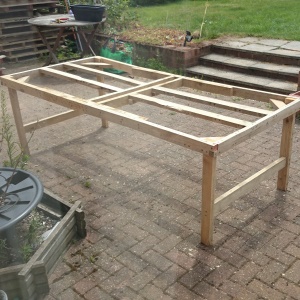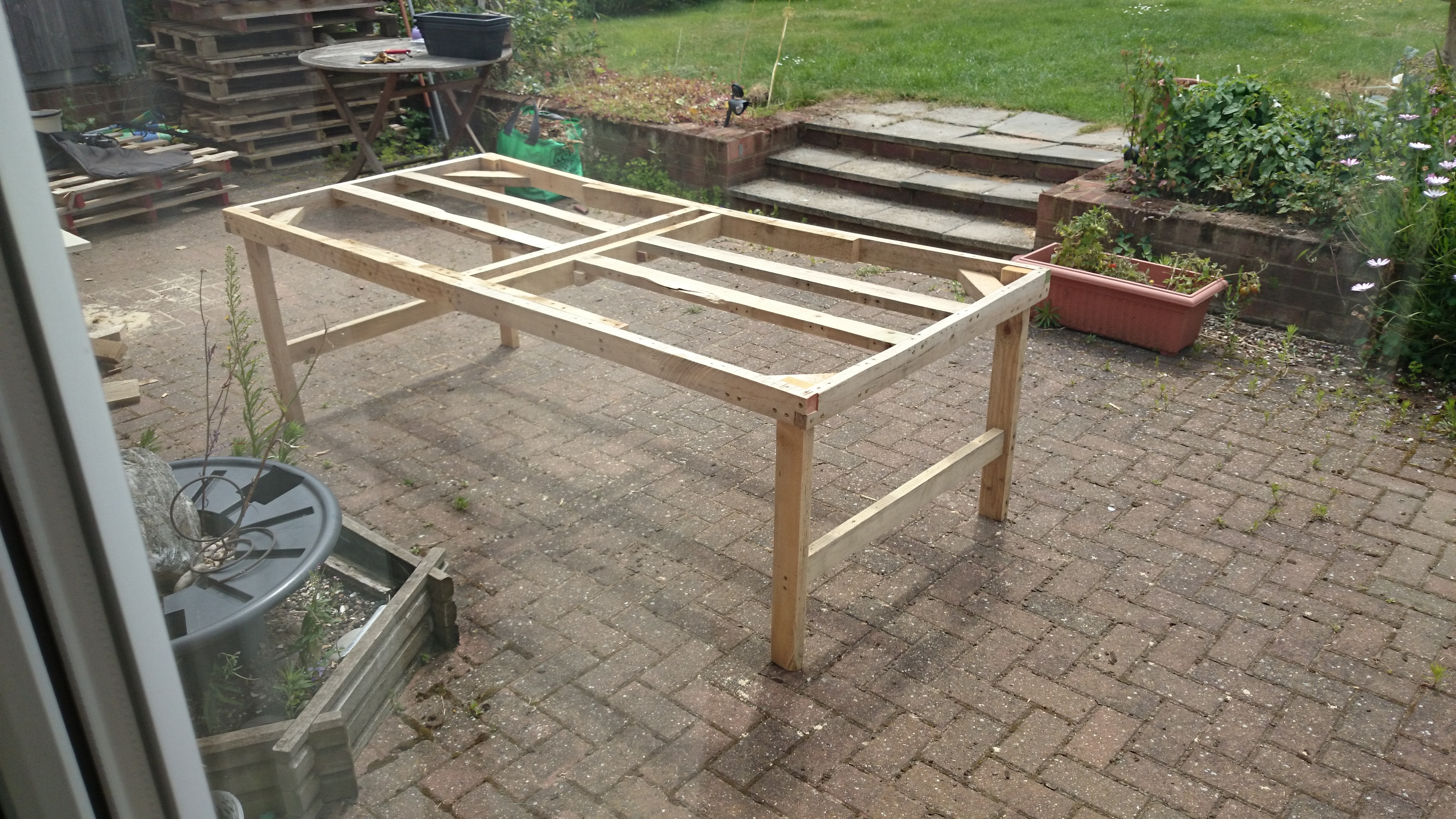 I had previously seen a garden table with sunken ice buckets in the middle of the table and though it looked like an awesome idea. From that I realised I'd need something structural in the middle to rest the weight on which is why there are two beams running the table length down the middle. I have yet to cut out the slats ready for the ice buckets, but it's on my TODO list :)