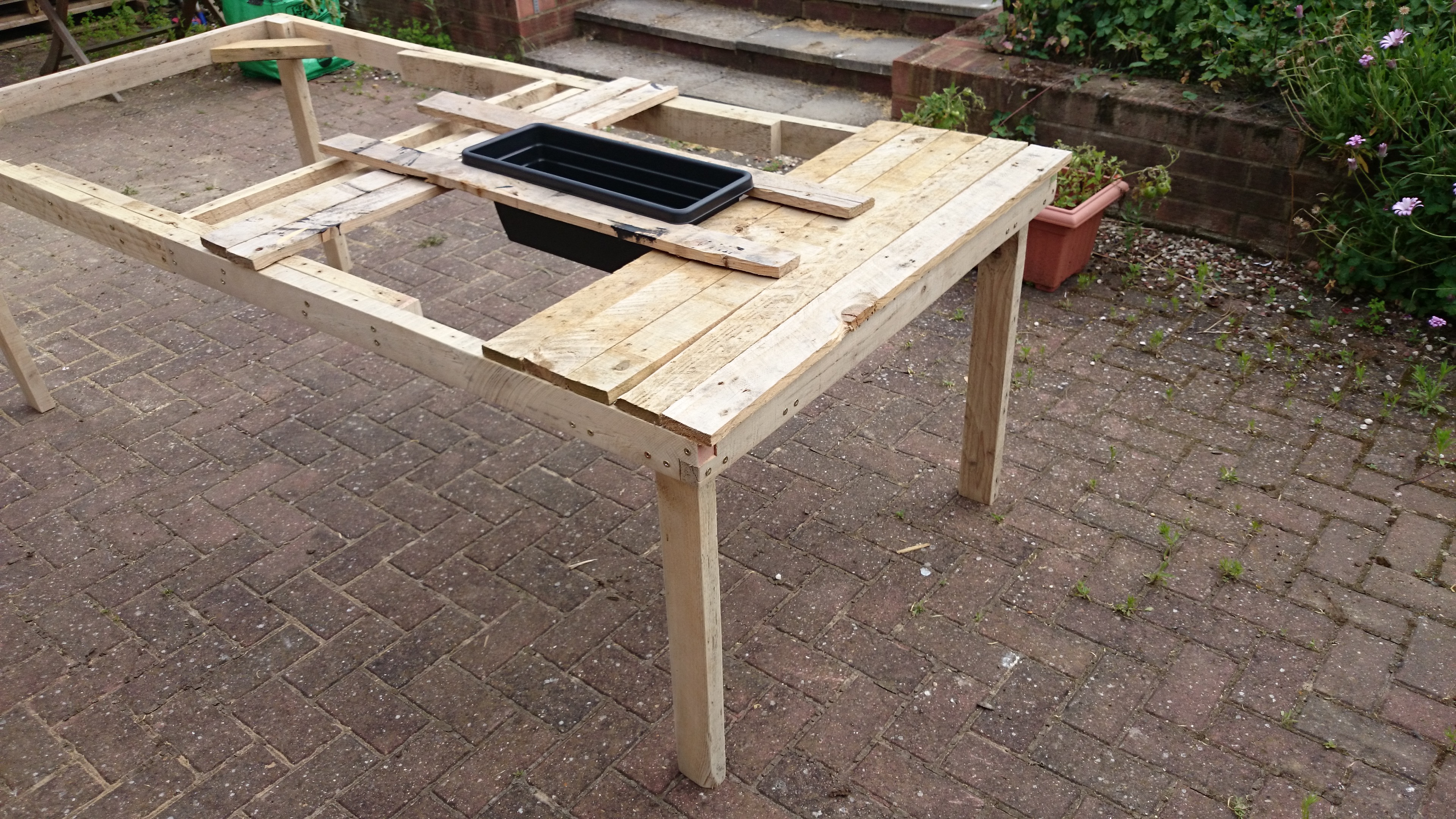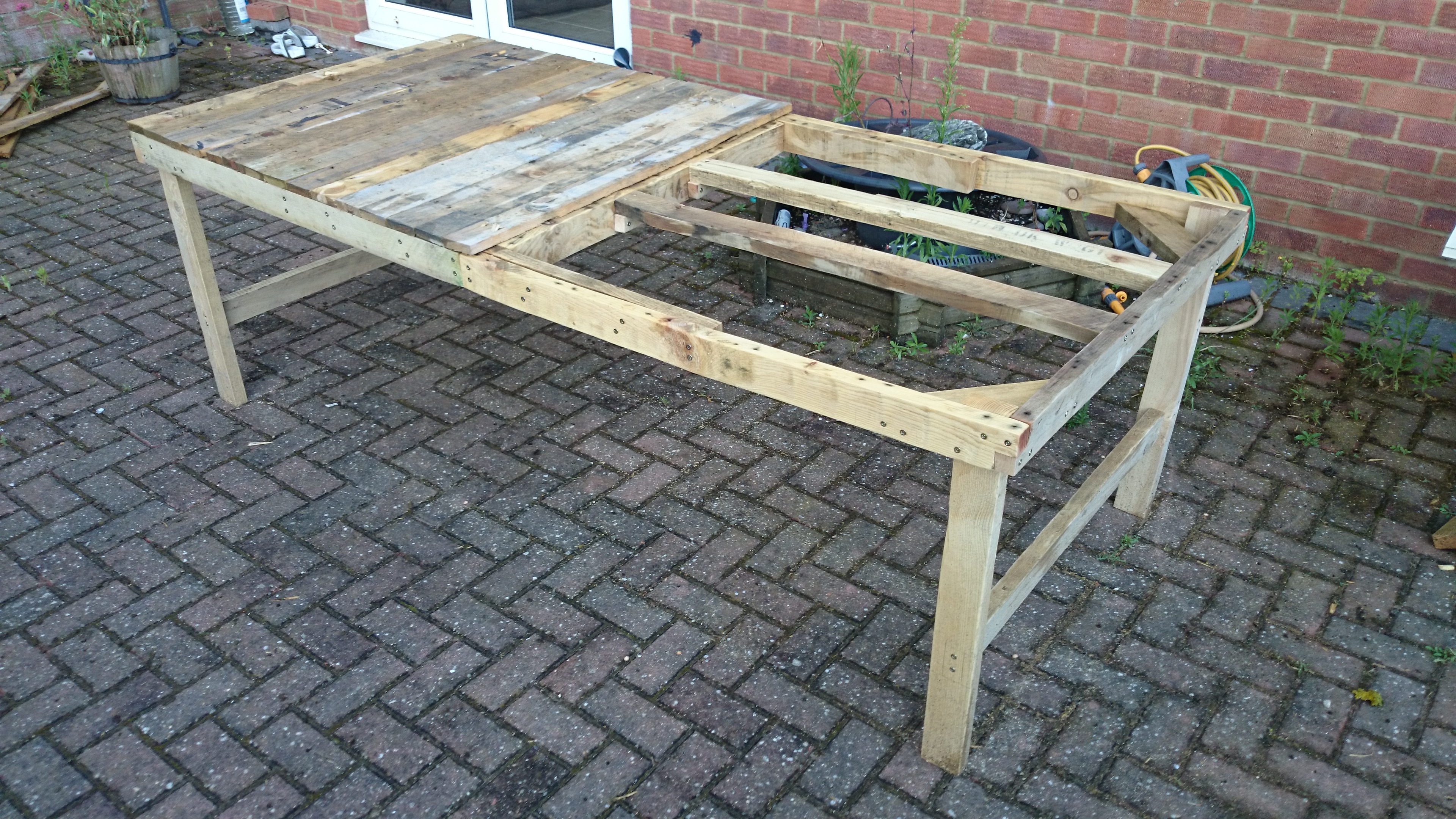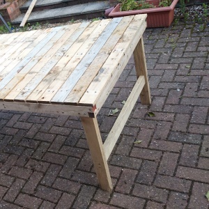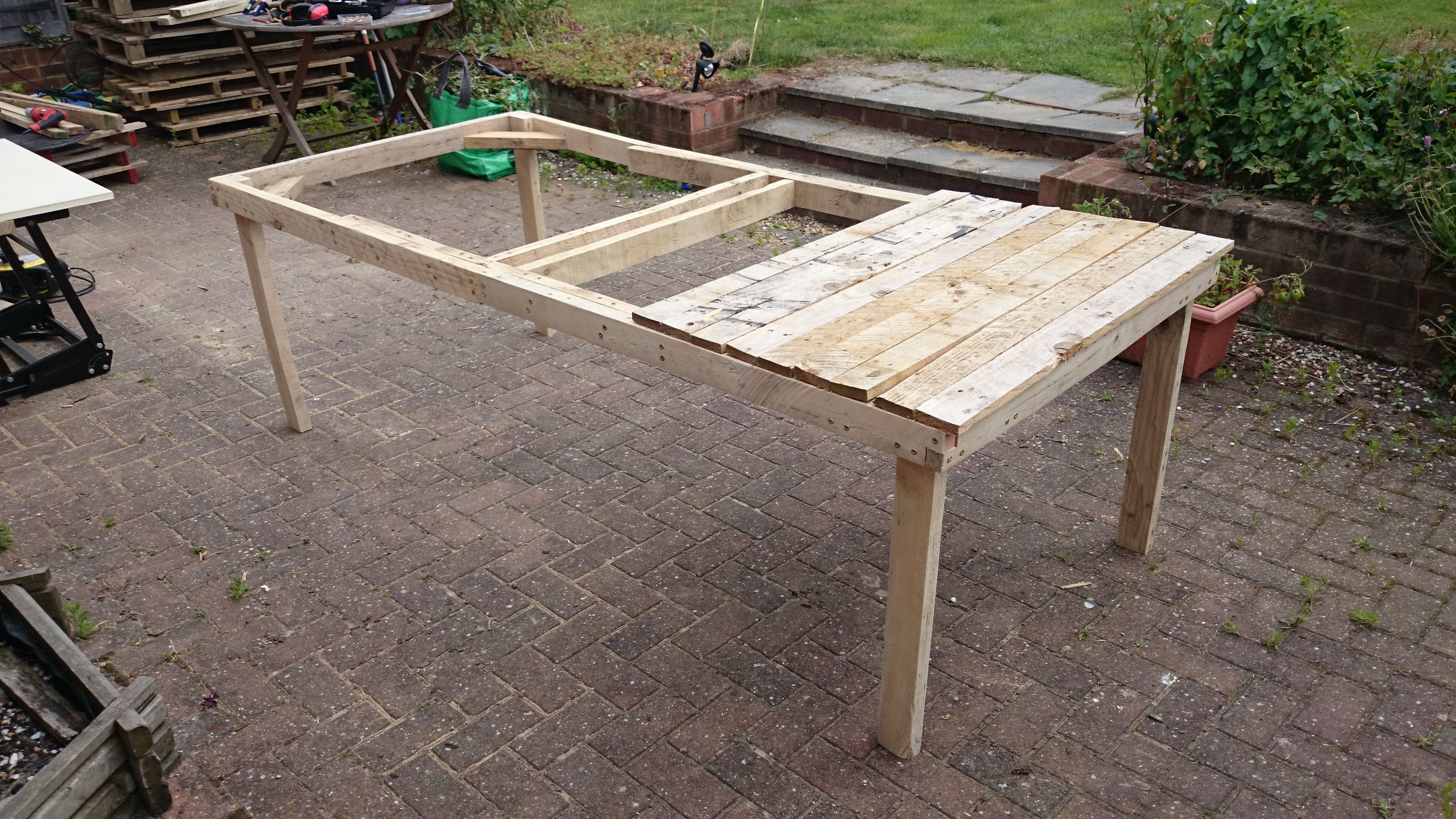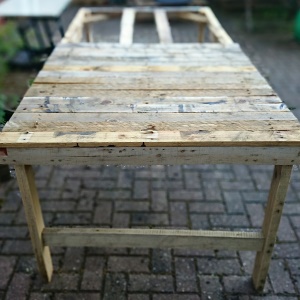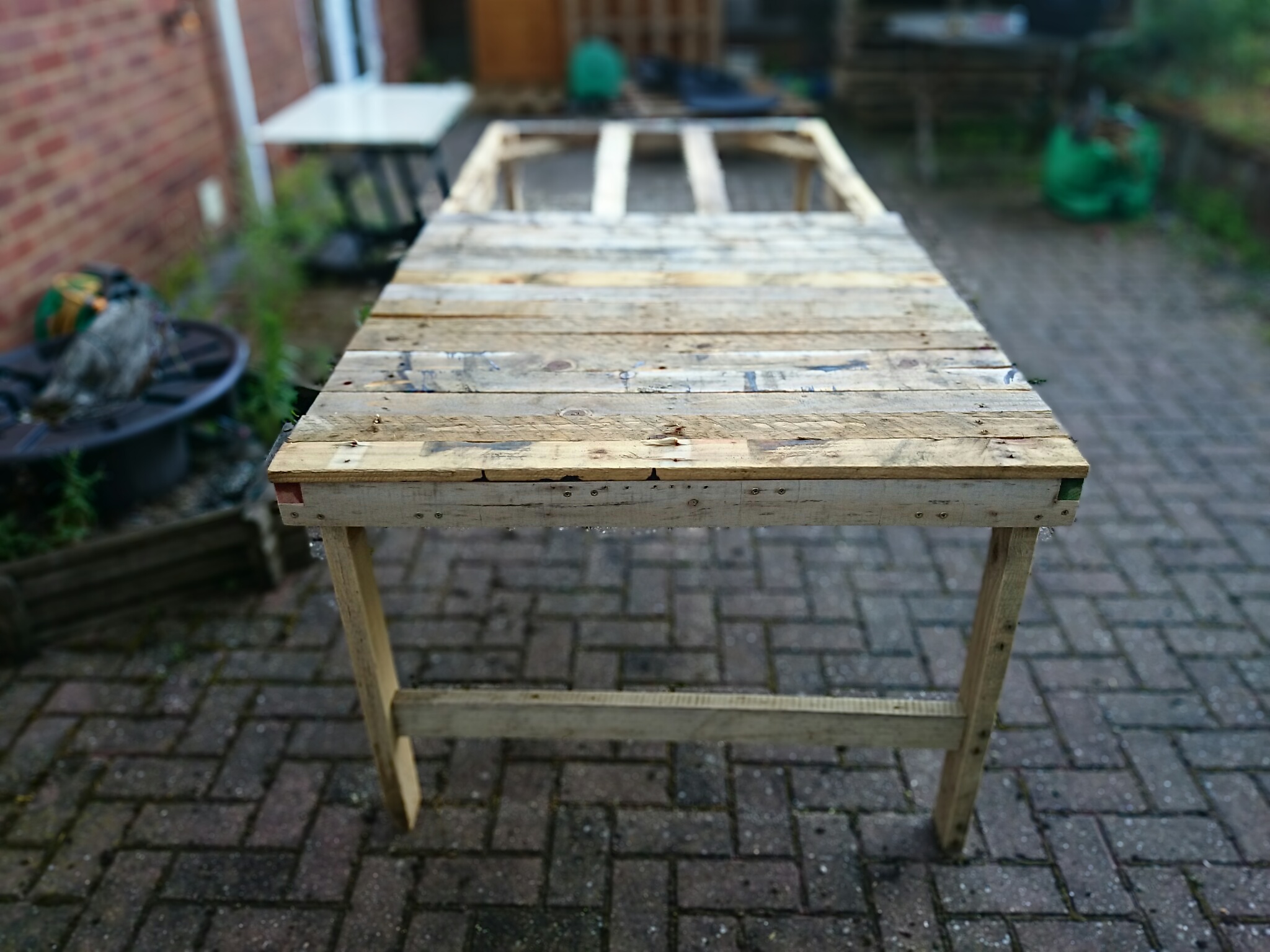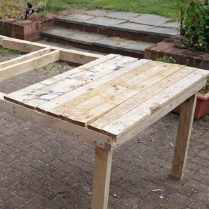 Pallets are usually made up from two plank types, several thin slat type planks on top with 3 thicker, more structural beams holding them together. Basically the width was determined by the length of the slats that were to be laid on top to use as the working surface. The height was determined by the length of the structural beams which handily was almost perfect standard table height. The table length was easily chosen as the length of two structural beams to give it a 2x1 rectangular shape.