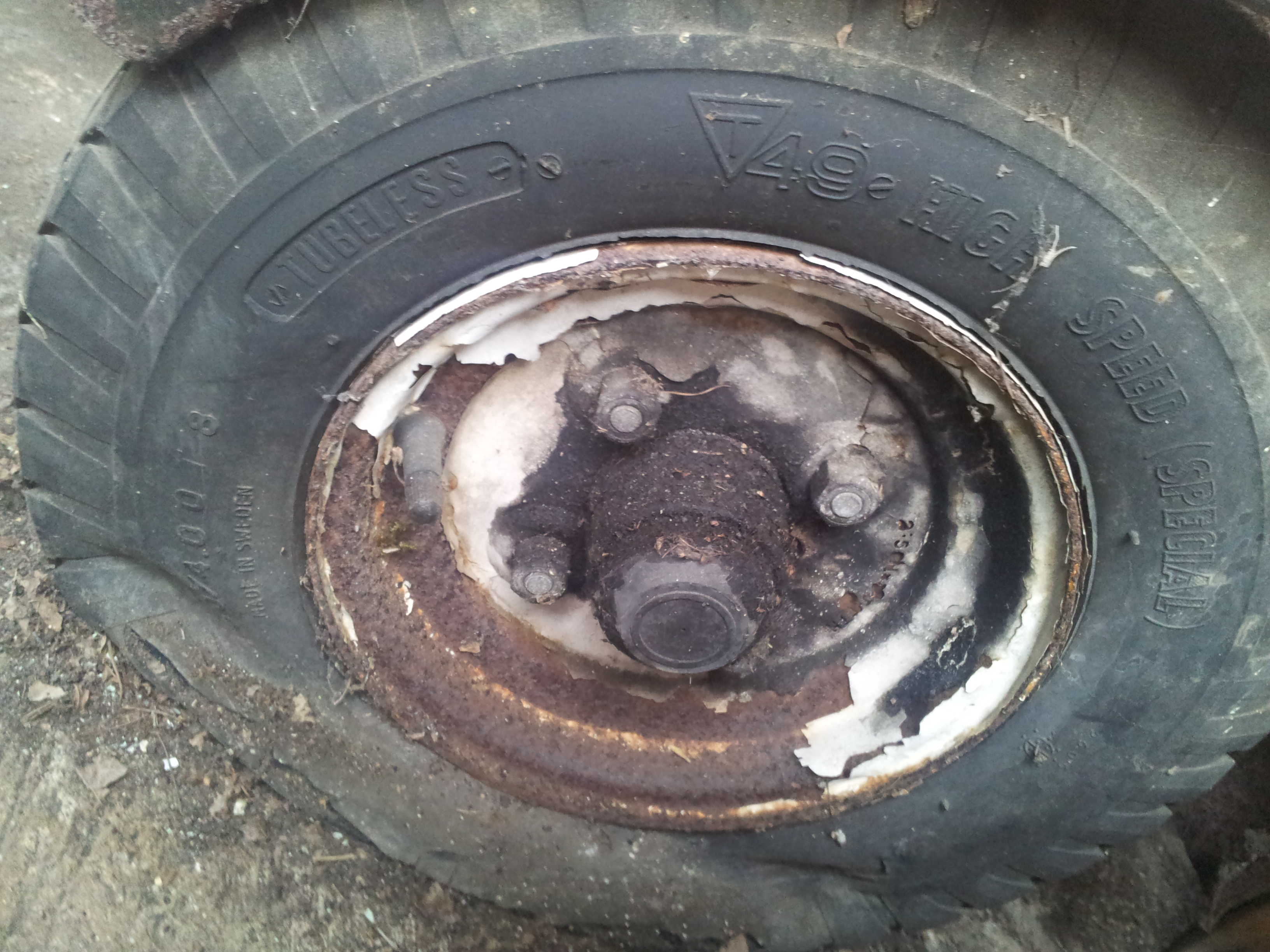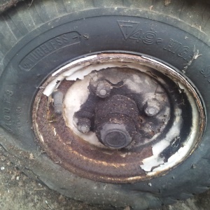 After quickly realising that the tyres had "bought the farm", I found replacements at my local trailer supply shop. Stupidly, for some reason new tyres on their own are only slightly cheaper than new metal rims with tyres already fitted. Seriously, it was only a few pounds more!